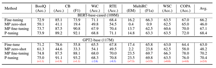 数据集 SuperGLUE。MP: Manual prompt