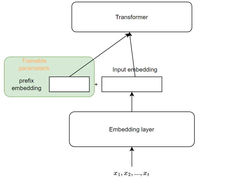 Prefix-tuning 时,原本模型的参数被冻结,这些虚拟 token 对应的向量就是可学习参数。有一点需要注意:如下图所示,为了增强表达力,不只是嵌入层后的第一个 Transformer block,Prefix-tuning 对模型的每个 Transformer block 的输入都加入了 Prefix vector。