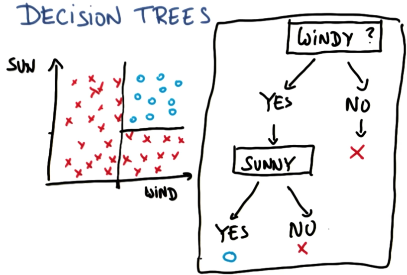 这时可以用决策树一个接一个地处理多元线性问题。其实本质上来说,可以首先问:有风吗?根据是否有风,我们可以在这个轴上设定一个阈值。根据不同答案,选择树的对应分支。实际上,这就等于在图上的位置设定一个线性决策面。