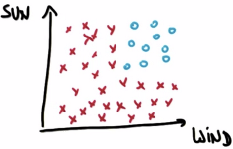 举个例子,有个叫 Tom 的朋友,他非常喜欢冲浪,而冲浪需要满足两个条件:要有风和太阳。我们列出去年每天的天气作为数据点,他不会在天气不够晴朗时冲浪,也不会在风力较弱的时候冲浪,但是当有风且天晴的时候,他就可以冲浪了。如下左图所示,很显然这个数据是线性不可分的。