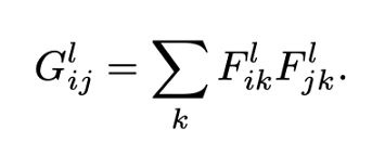 Gram矩阵(对于VGG网络的l层)是向量化特征映射F_i和F_j(在l层)的内积,它捕捉了特征在图像不同部分同时出现的趋势。