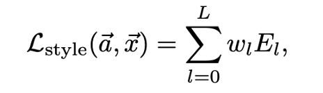 这里,G^l^和A^l^分别是模型输出的l层和目标图像的l层的风格样式表示。N~l~是层l中不同特征映射的数量,M~l~是层l(i)中特征映射的容量(也就是通道的宽和高)。最后,E~l~是图层l的纹理损失。
