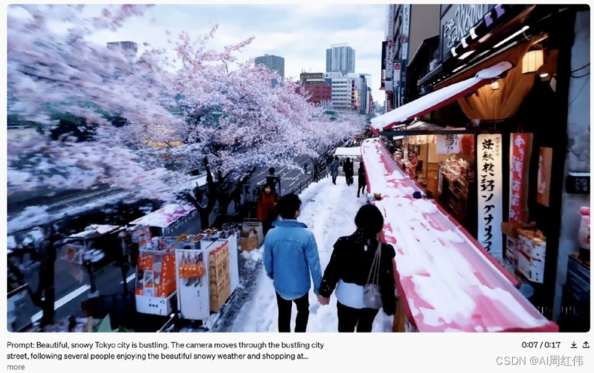 OpenAI发布首个视频大模型Sora,一句话生成一分钟视频。Sora可以直接输出有多个角色、多种场景和运镜的画面。比如一段提示词为:镜头穿过熙熙攘攘的东京街道,跟随几个人享受雪天并逛街。在Sora生成的视频中,镜头从天空的雪花中俯冲,跟着一对牵手的情侣,走过日本风格的街道。