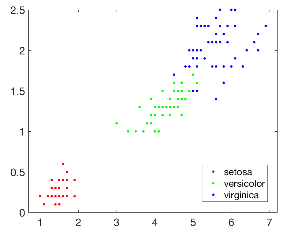 首先在Matlab中载入数据,代码如下,其中meas( : , 3:4)相当于取出(之前文章中的)Petal.Length和Petal.Width这两列数据,一共150行,三类鸢尾花每类各50行。
