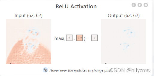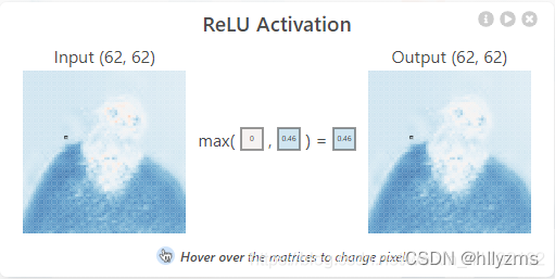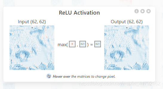 此激活函数逐元素应用于输入张量的每个值。 例如,如果对值 2.24 应用 ReLU,结果将是 2.24,因为 2.24 大于 0。您可以通过单击上面网络中的 ReLU 神经元来观察如何应用此激活函数。 整流线性激活函数 (ReLU) 在上述网络架构中的每个卷积层之后执行。 注意这一层对整个网络中各种神经元的激活图的影响!