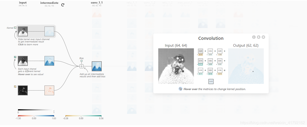 图1:当您将鼠标悬停在第一个卷积层最顶层节点的激活图上时,您可以看到应用了 3 个内核来生成此激活图。 单击此激活图后,您可以看到每个唯一内核发生的卷积操作。图片所选择的偏差为:0.0842