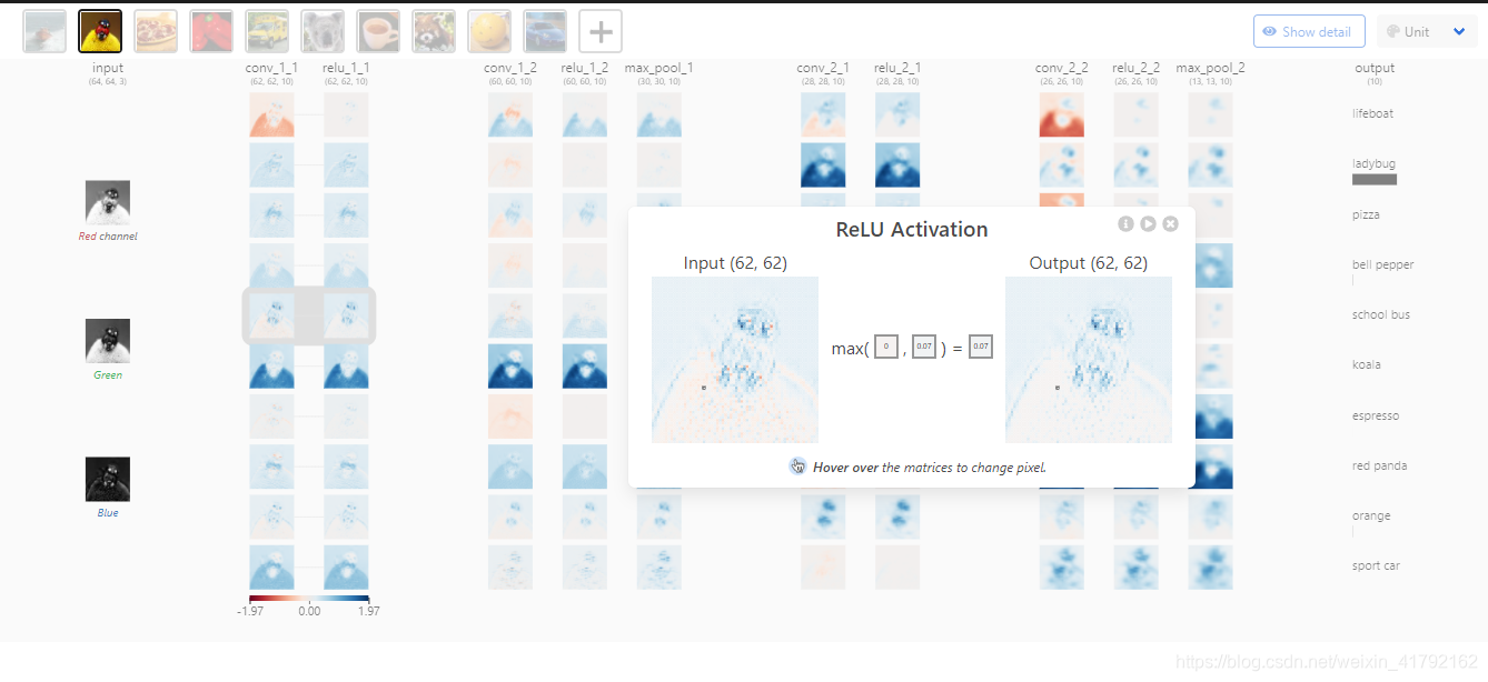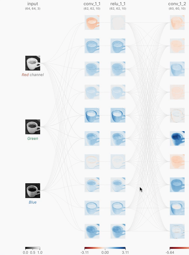 让我们来看看网络中的每一层。 在阅读时,通过单击并将鼠标悬停在上面的可视化的各个部分,随意与上面的可视化进行交互。