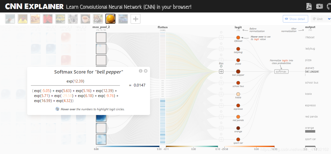 softmax 操作有一个关键目的:确保 CNN 输出总和为 1。因此,softmax 操作可用于将模型输出缩放为概率。单击最后一层会显示网络中的 softmax 操作。请注意展平后的 logits 没有在 0 到 1 之间缩放。为了直观地指示每个 logit(未缩放的标量值)的影响,它们使用浅橙色 → 深橙色色标进行编码。通过 softmax 函数后,现在每个类对应一个合适的概率!