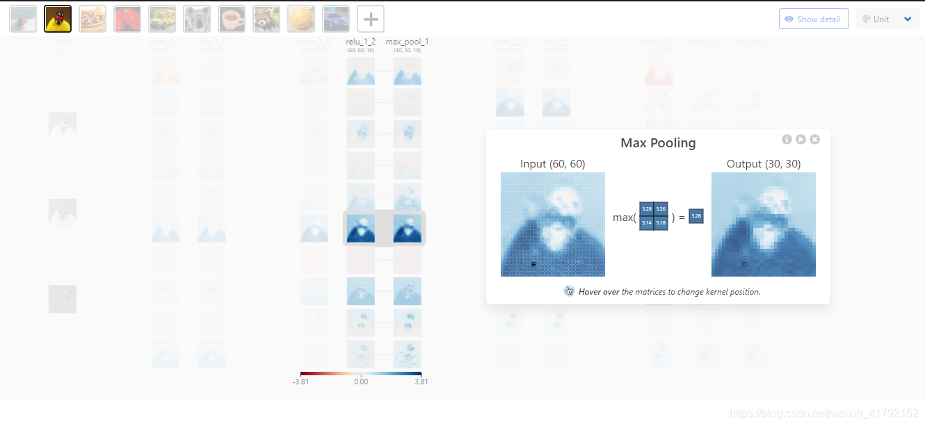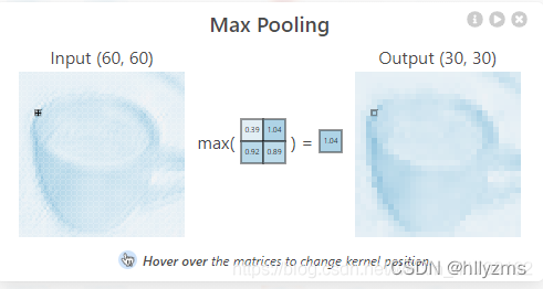 Max-Pooling 操作需要在架构设计期间选择内核大小和步长。 选择后,该操作会在输入上滑动具有指定步长的内核,同时仅从输入中选择每个内核切片的最大值以生成输出值。 这个过程可以通过点击上面网络中的一个池化神经元来查看。