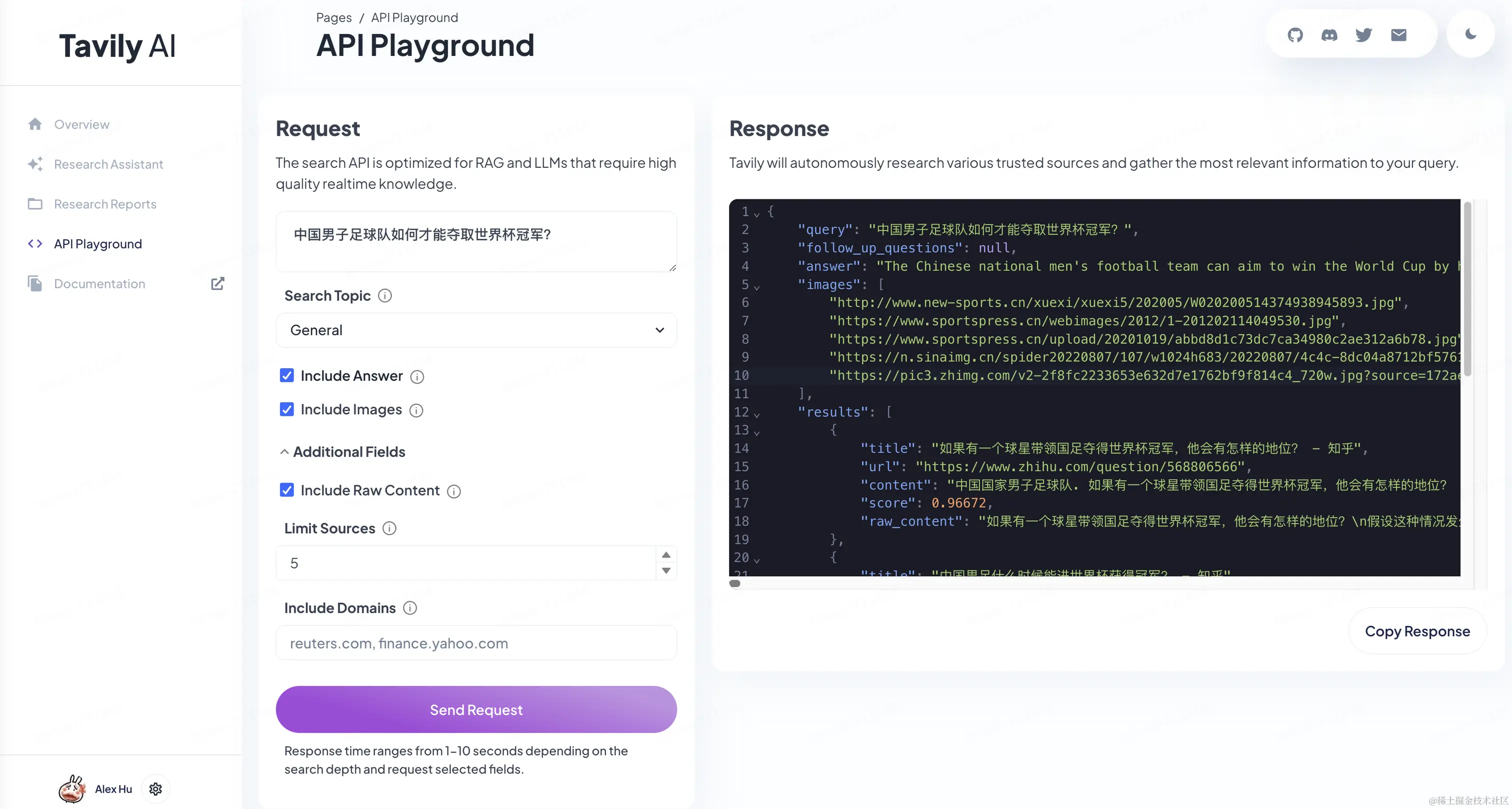 Tavily可以提供一个沙箱(APIPlayground),供用户测试其“针对高质量实时知识优化的大模型增强检索”API,沙箱只开放通用知识库(垂直的高质量实时知识库需要付费才能使用),沙箱的测试结果会返回互联网上的相关知识集。我提出了一个极富挑战性的课题进行测试,效果如下图: