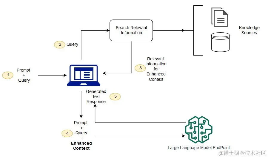 一般来说RAG的工作原理是:首先利用一个检索组件在知识库(这个过程一般使用向量数据库实现)中查找与用户查询相关的文档或数据,这一步骤确保了生成过程基于的是与查询高度相关的信息。随后,这些检索到的信息被送入一个生成模型(如GPT系列大模型),该模型结合检索到的信息和原始查询生成详尽的回答或内容。其核心流程如下图(参考:aws.amazon.com/cn/what-is/…):