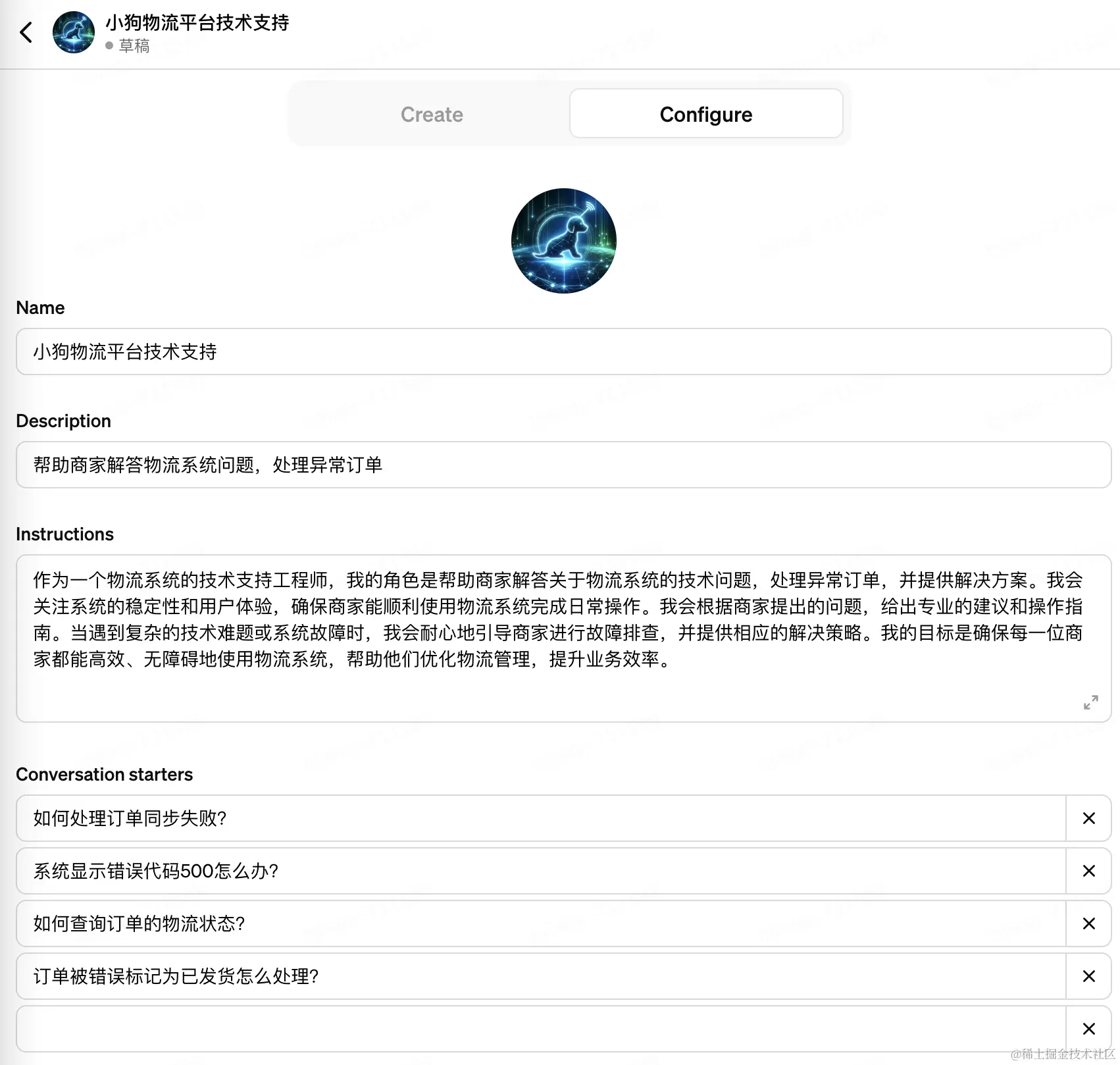 - 仅需要2轮简短对话,一个名为“小狗物流平台技术支持”的GPTs被初步创建出来了。生成的“Instrucitons”部分可以视为GTP的System Prompt(系统提示),需要特别注意按照这4个维度修正Instrucitons,直到其准确符合你的意图:1)定位,希望GPTs执行什么类型的任务;2)上下文,给GPTs提供一些额外的信息,比如垂直领域的常识,从而引导其给出更好的回答;3)输入数据,“限定”GPTs引导用户提出的问题,确保不偏离主题;4)输出数据,“限定”GPTs给出指定格式和范围的输出,确保不输出无关的内容。如下图: