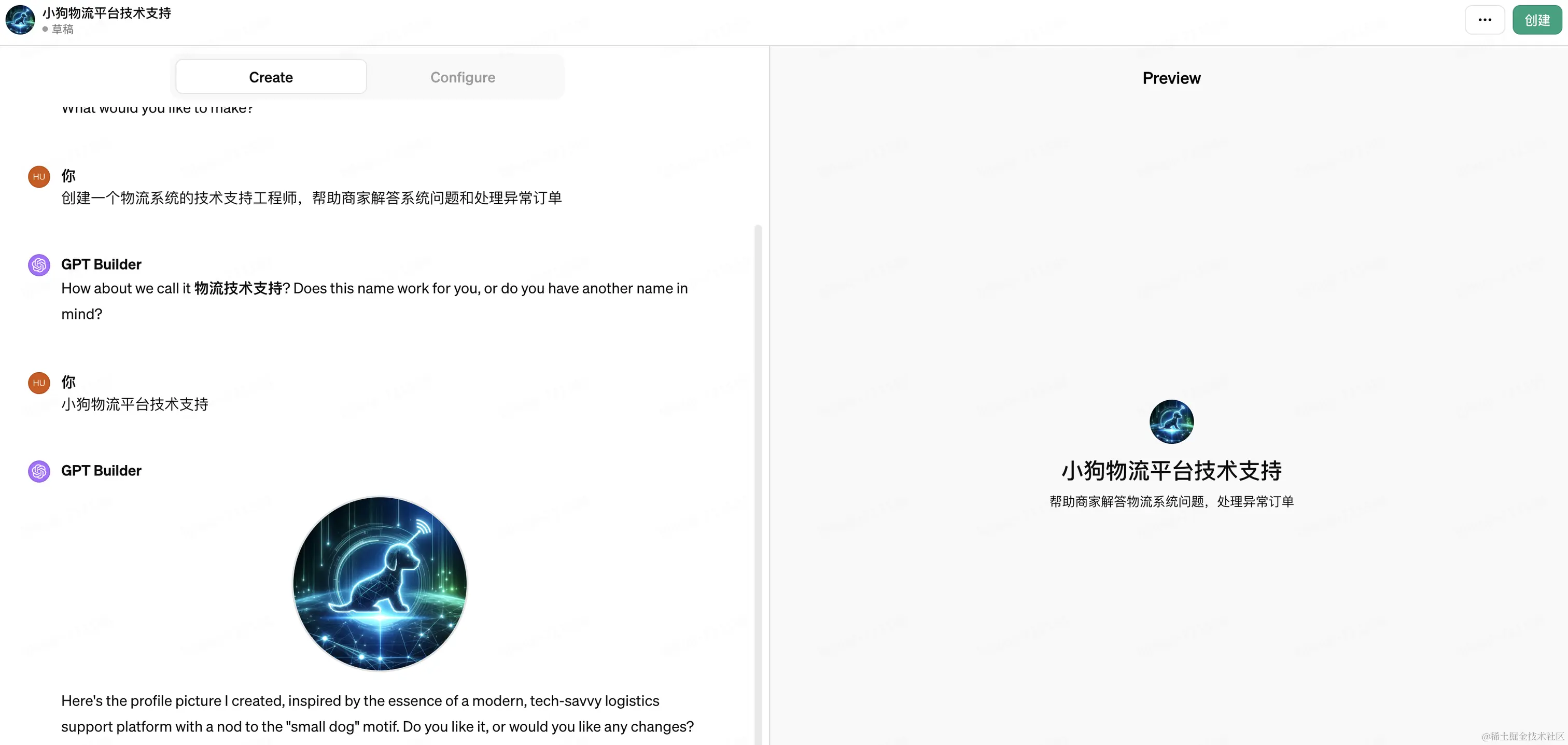 - 输入“创建一个物流系统的技术支持工程师,帮助商家解答系统问题和处理异常订单”,接下来GPT Builder会和你做一些j简单的对话,比如征求你对于命名、Logo的建议等等,如下图: