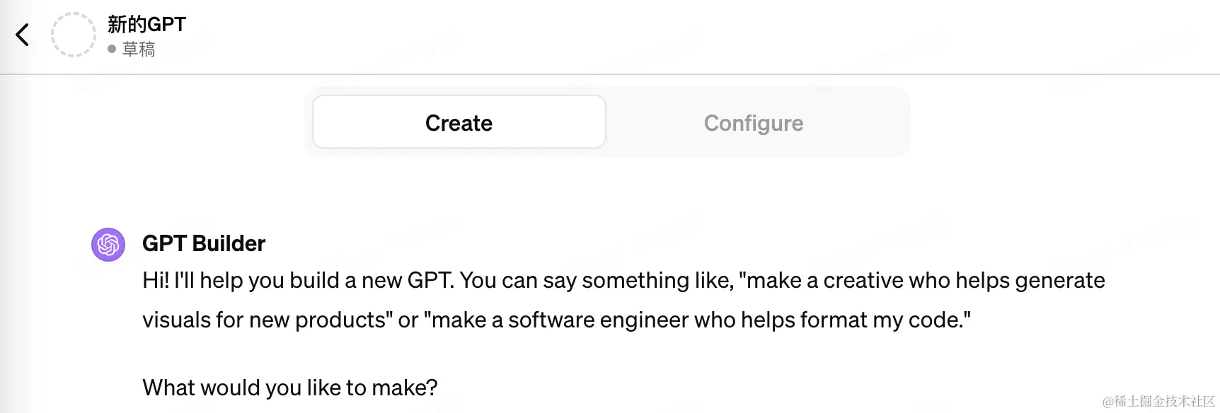 - 告诉 GPT Builder向导(实际上这也是一个官方的GPTs)你要做什么,它会提示你可以这样说:"制作一个帮助生成新产品视觉效果的创意人 "或 “制作一个帮助我格式化代码的软件工程师”。如下图: