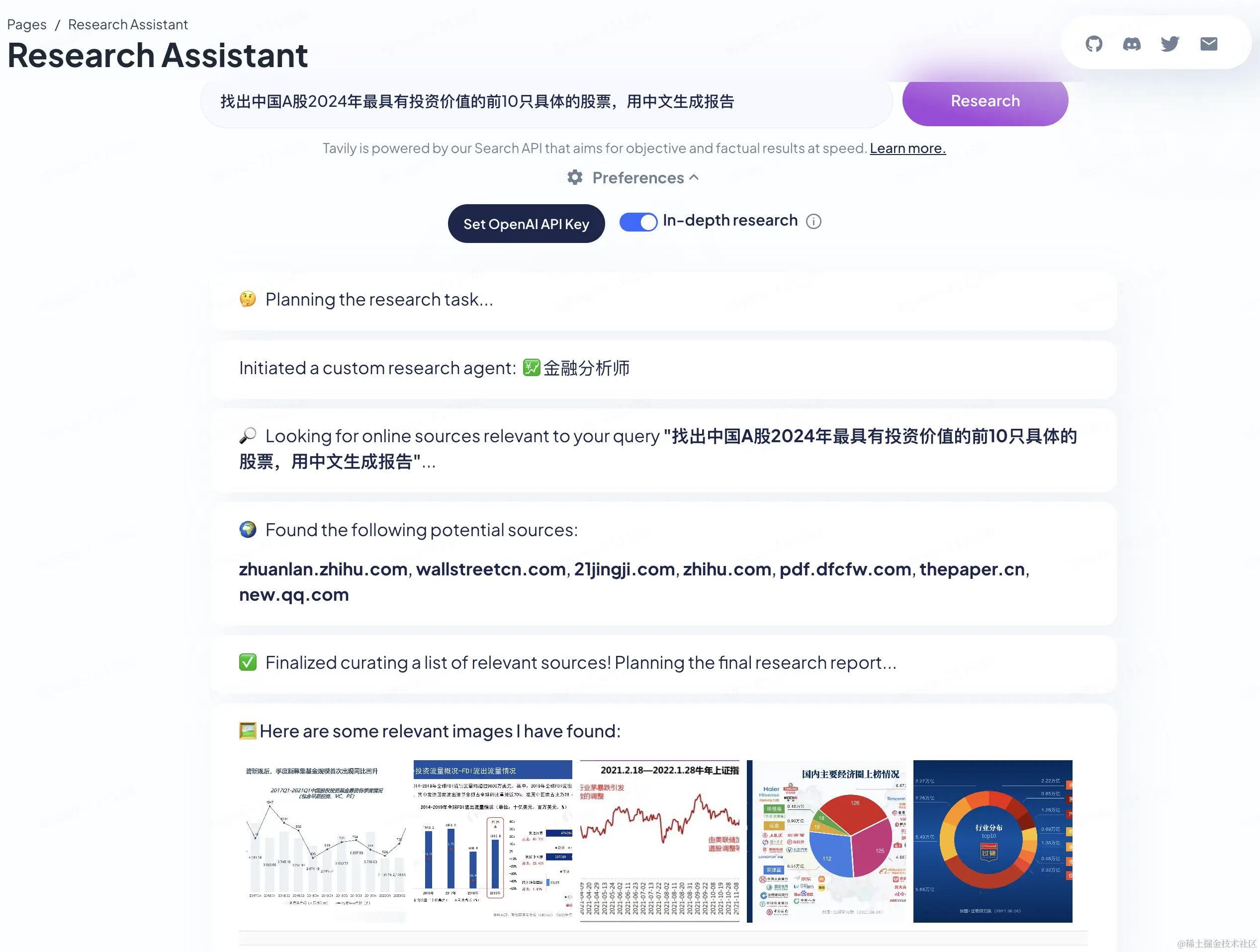 Tavily还提供了一个研究助手(Research Assistant)的Web应用,供用户在线使用智能体产品,需要用户使用自己的OpenAI API Key调用GPT4服务,支持“深度研究”,也就是要消耗更多的算力和时间(钱)获得更高质量的结果。我提出了一个很直接很实用的课题进行测试,消耗了大约2元多人民币的API调用费,获得了一份大约1500字的报告,过程如下图: