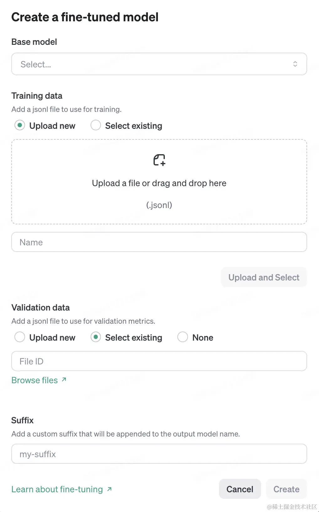 同时,你仍然可以通过传统的“fine-tuning model”API定制自己的微调大模型,这种方式主要是通过你上传格式化的“问-答”型的训练数据文件来实现对LLM的“增强”。相对于最新推出的“Assistant API” ,感觉这种方式在工程化的显得不够灵活和直接,不是很“智能”,目前“fine-tuning model”最高也只能支持GPT-3.5系列模型。如下图: