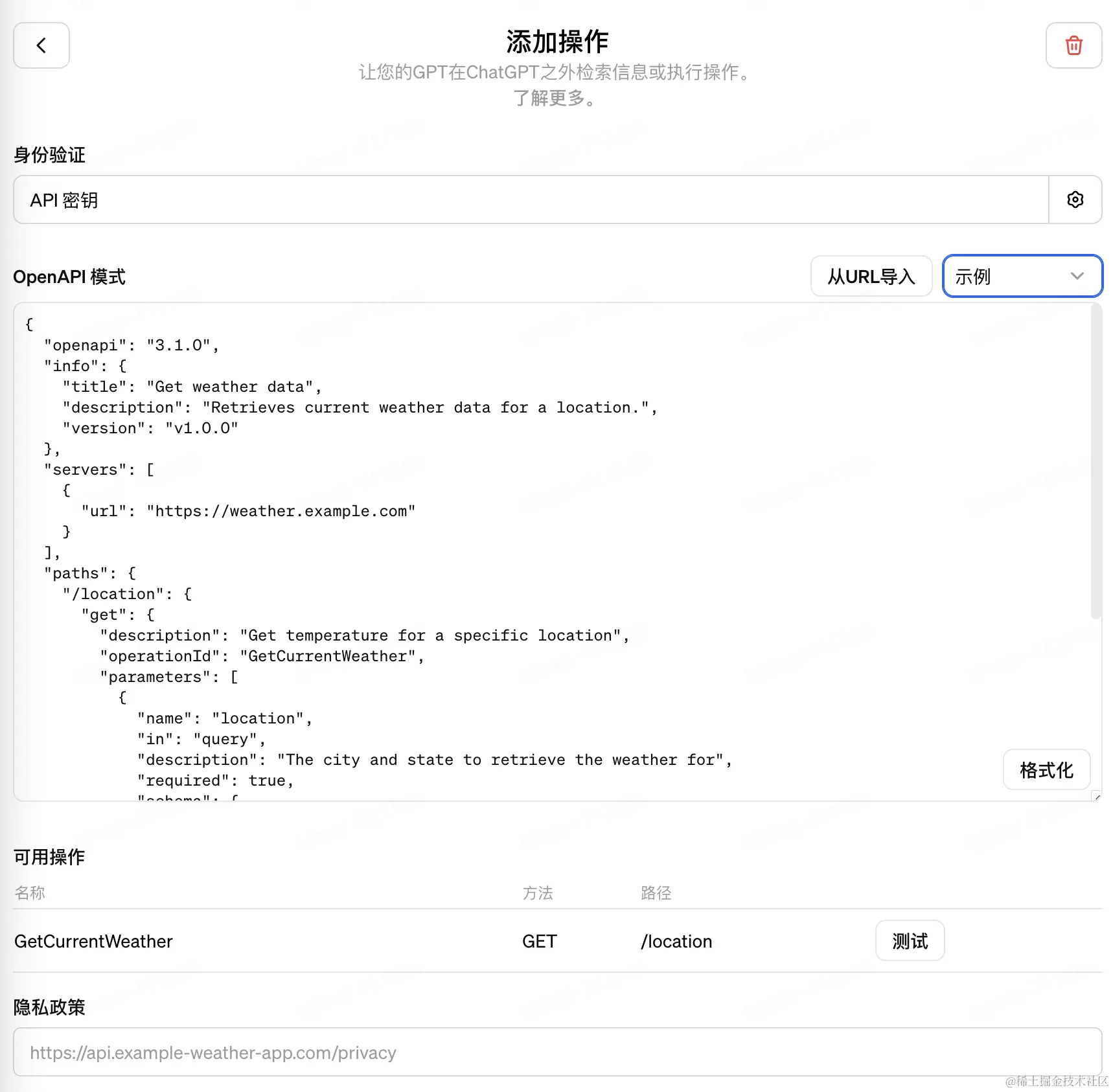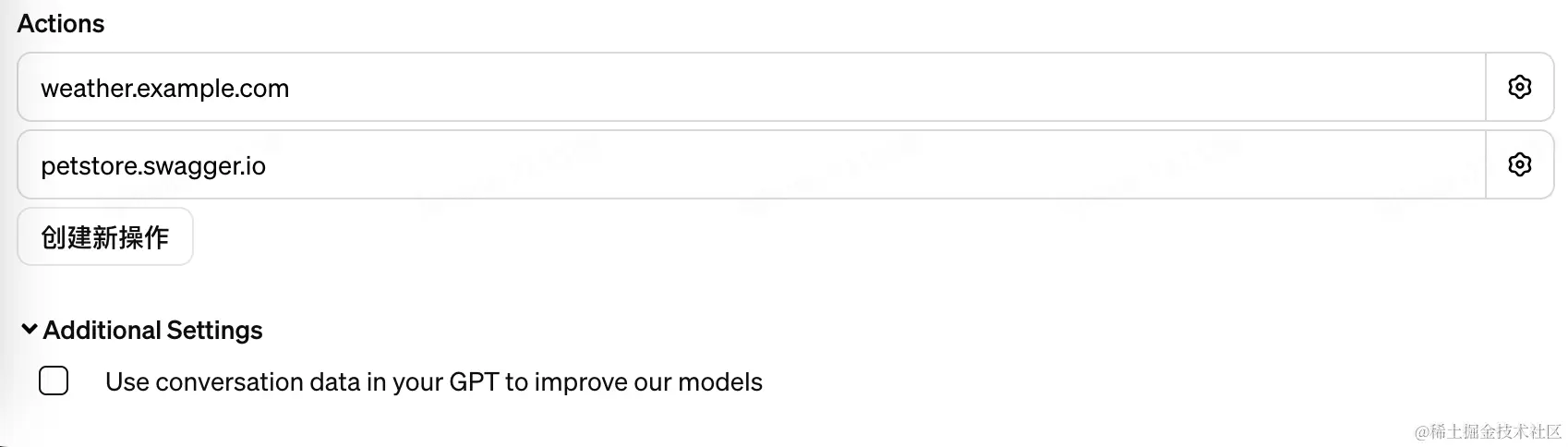 - 更重要的是,可以通过添加“Actions”的方式,接入你的API服务给到大模型调用,API通过遵循OpenAPI3的规范进行自描述。大模型可以根据API的功能描述以及输入输出定义,结合用户会话上下文进行智能的调用,获取你的私域数据进行推理,这可以理解是一种对LLM的“动态”增强。如下图: