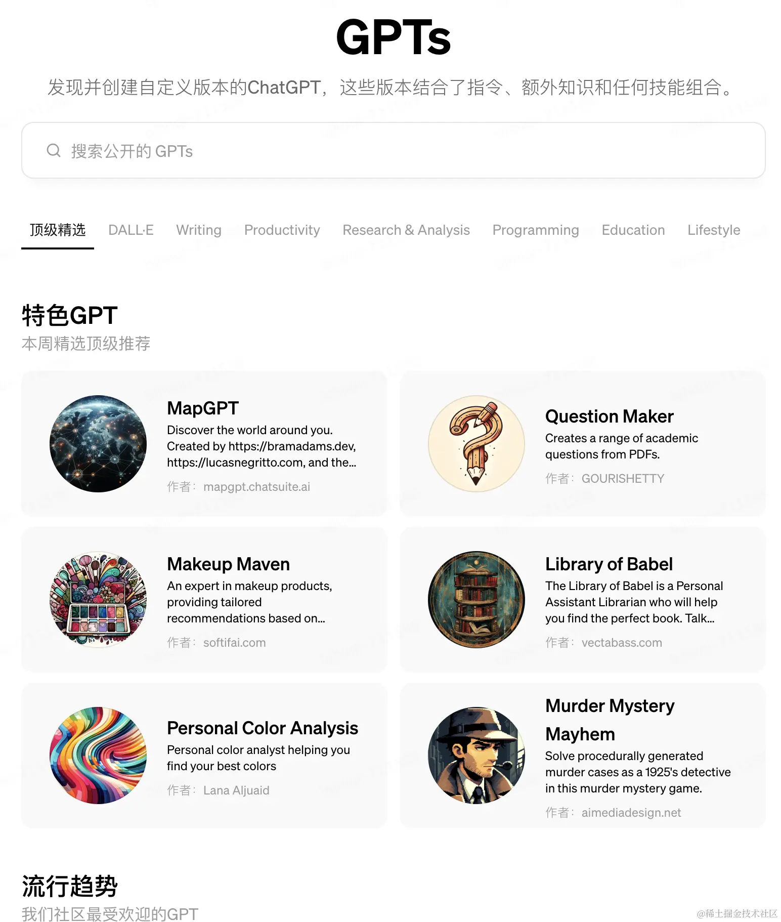 GPTs商店自2024 年初上线以来3个月时间,已经有超过 300 万个自定义的 ChatGPT发布。商店的功能包括2个排行榜,分别是“顶级推荐”和“流行趋势”;具体的分类有 DALL-E图像创作、写作、效率、研究和分析、编程、教育以及生活方式共7项,并且将由ChatGPT官方创作的自定义模型进行单独分类展示。例如在研究和分析(Research & Analysis) 类排名第二的“Scholar GPT”能够利用Google Scholar、PubMed、JSTOR、Arxiv等学术库的2亿+资源和内置的批判性阅读技能,助力你提高研究水平,可谓是撰写论文的神器;在效率(Productivity)类排名第一Canva能够轻松帮助你设计演示文稿、徽标、图文混排等多种内容,并且支持你直接在其提供的Web应用上对AI生成的源文件进行编辑调整,直到达成满意的效果。目前,已经有创作者通过GPTs商店独特的AI生态,实现了自己的商业模式,值得我们学习借鉴。