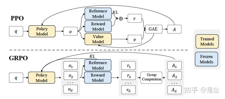 • GRPO :GRPO是PPO的改进版,不依赖于value network,通过生成同一个样本的多个输出,然后计算每个输出的奖励与组内平均奖励的差值,然后使用KL散度来约束模型与reference model的偏离程度。
