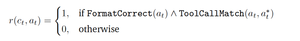 过滤掉包含无效工具调用的样本(特别是那些涉及候选工具列表中缺失工具的样本), 标准化数据集。从系统提示中提取可用工具,并将候选工具和真实工具调用解析为结构化字典格式。JSON 解析失败或包含格式不一致的实例将被丢弃。这种预处理过程生成了一个干净且一致的数据集,适用于强化学习。对于来自 ToolACE 子集的多轮数据,进一步将每个轨迹细分为多个单步预测实例(把多轮拆成多个单轮,复用现有的infra),其中每个实例包含一个目标工具调用,并将前面的步骤视为上下文。使用GRPO训练,根据这些上下文信息和提供的工具来预测每个工具调用步骤。