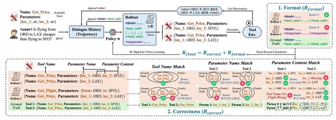 Tool-Calling Checking : 检查工具调用本身的正确性。工具调用输出被解析为字典,以便与真实调用进行精确匹配。这包括检查预测的工具名称是否与真实调用匹配,以及所有必需的参数是否都具有正确的值。这种严格的匹配标准确保模型能够学习生成功能精确且可执行的工具调用。与 SFT 中的下一个标记预测逻辑相比,这种基于字典的匹配带来了更大的灵活性。它允许参数顺序变化而不会受到惩罚,从而鼓励模型专注于工具调用的底层语义,而不是停留在表面记忆。这种设计有助于更深入地理解工具的使用,并支持更好的泛化。