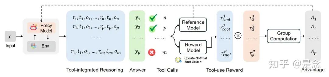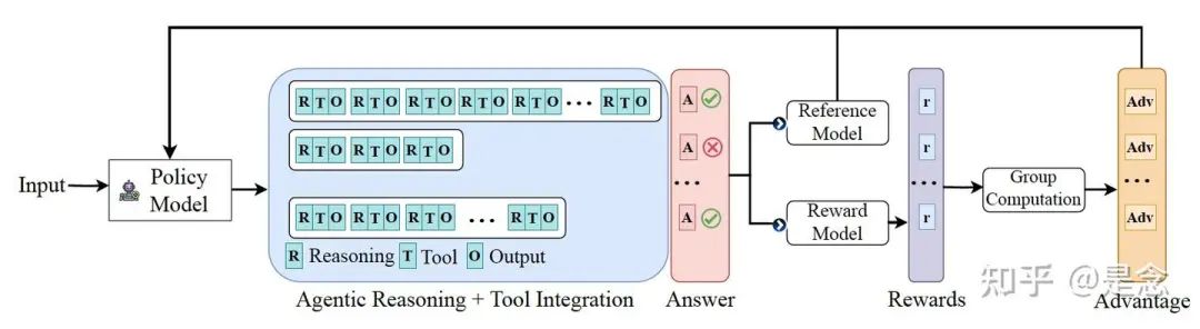 发出工具查询后,模型会调用相应的工具或环境,附加输出,并继续推理循环,直到得出答案。 Rollout Process: 每次rollout都由这些结构化片段组成,策略模型在每个步骤中决定是进行内部推理还是与外部资源交互。