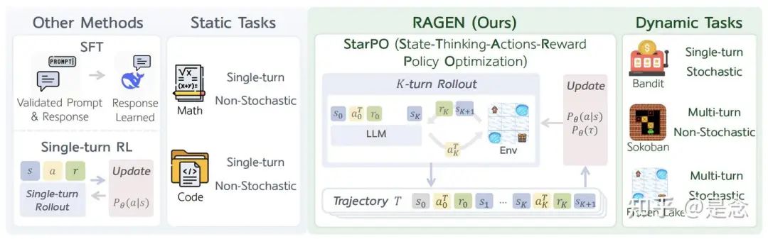 论文提出了 StarPO(状态-思考-行动-奖励策略优化),这是一个用于轨迹级智能体 RL 的通用框架,并介绍了 RAGEN,一个用于训练和评估 LLM 智能体的模块化系统。本研究有三个核心发现。