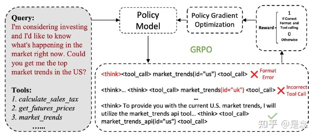 DeepSeek R1带火基于GRPO的强化学习技术后,agentic tool use learning也开始用上了GRPO,Reinforce++, PPO, policy gradient等各种算法了(以前是SFT+DPO,需要大量的标注数据来cover bad case,当时标注高质量数据都把我标哭了),想让大模型学会使用code interpreter, web search等工具来增强现有模型的数学和推理能力, 单轮就是调用一次tool,多轮就是调用多次tools, 多轮tool use更难一点,主要是数据难以获取和建模方式(MDP这种只考虑当前状态的训练模式,还是使用full history,考虑所有的状态的模式)不清晰,tool-use rl也算是一个新的研究方向了,潜力还有待挖掘。