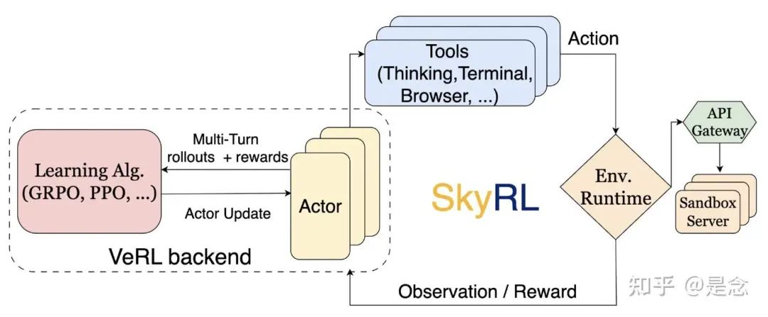 最近的工作还是集中设计这个multi turn tool-use的prompt template,以及训练的时候需要设计rule based reward(correctness reward, format reward, tool execcution rewad等), 训练的tool output的mask操作,sampling的时候加入异步并行,融入megatron的pipeline parallel,加入多模态信息等等,训练的范式基本是先收集一波expert trajectory做sft,然后使用rl训练(例如ReTool),或者直接应用RL(例如TORL,ToolRL,OTC等),目前还没有出现一个真正为agent rl设计的方法,都是复用现有的基建(比如verl, open-rlhf, trl, ms-swift),做了一些拓展。