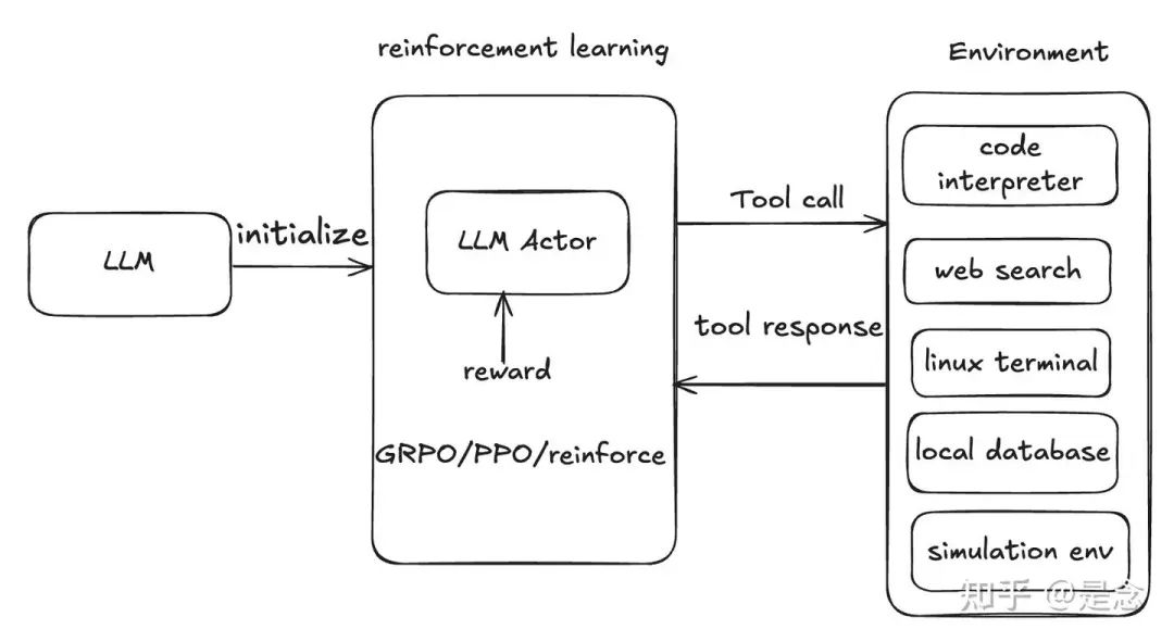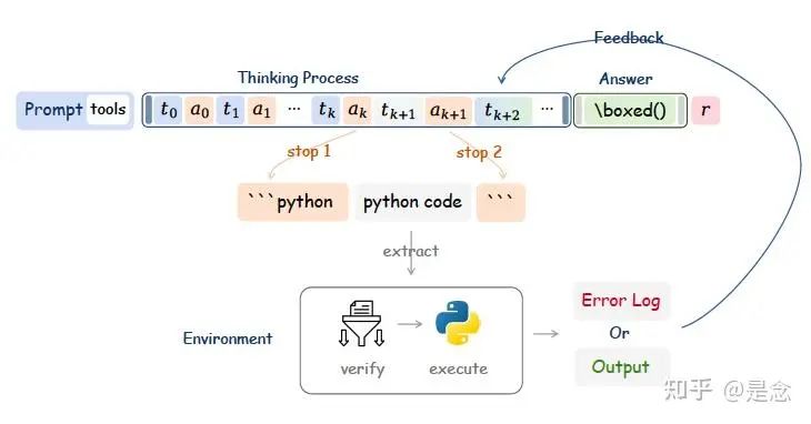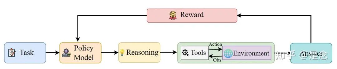 工具调用可能包括代码执行、API 调用、Web 搜索、文件操作或在交互环境(例如 Web 浏览器或操作系统)中的操作。这些交互的输出会被重新整合到推理链中,从而实现基于反馈的迭代改进和自适应策略调整。