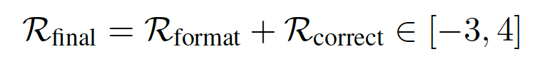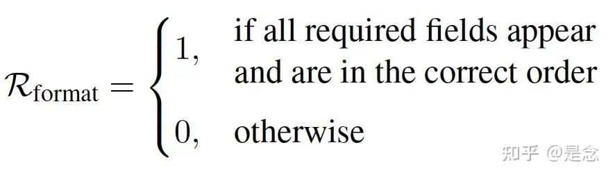 Format Reward : 奖励格式 Rformat ∈ {0, 1} 检查模型输出是否按照基本事实指定的正确顺序包含所有必需的特殊token: