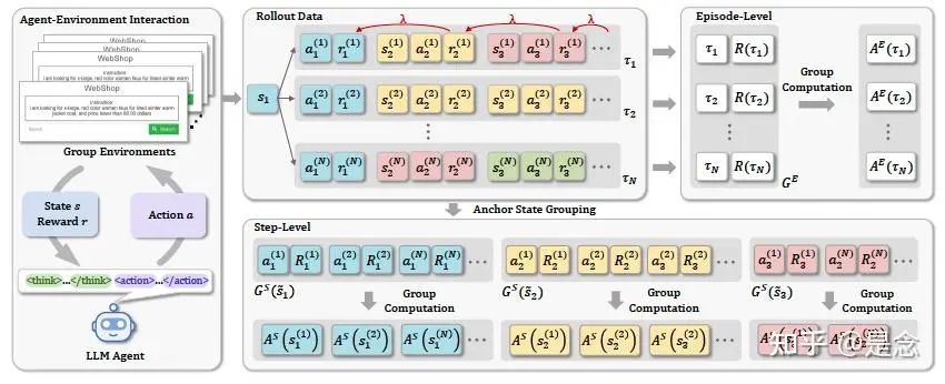 • (ii) 在步骤级别,GiGPO 引入了一种锚定状态分组机制,该机制通过识别跨轨迹的重复环境状态来追溯构建步骤级别的组。