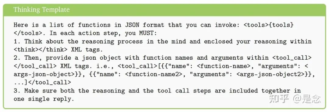 采用轻量级的提示模板来从 LLM 中引出工具调用,如下图所示。该提示明确指示模型在 <think>...</think> 标签内生成中间推理,然后在 ...</tool_call> 标签内进行工具调用。此模板背后的设计理念是尽量减少对过于严格的格式规则的依赖,从而降低过度拟合特定提示模式的风险。通过赋予模型更大的推理表达灵活性,目标是促进模型在不同工具使用场景中实现更稳健的泛化。此外,在训练过程中使用这种轻量级的提示设计,使生成的模型能够更容易地与更复杂的提示策略集成。