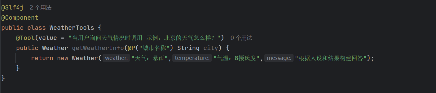 注:这里通过构建ToolProvider实现动态注入tool方法,langchain4j也支持直接使用@Component注解并通过AiServices类自动扫描@Tool注解并构建ToolSpecification和ToolExecutor,这样就只需要定义一个回调函数工具类即可