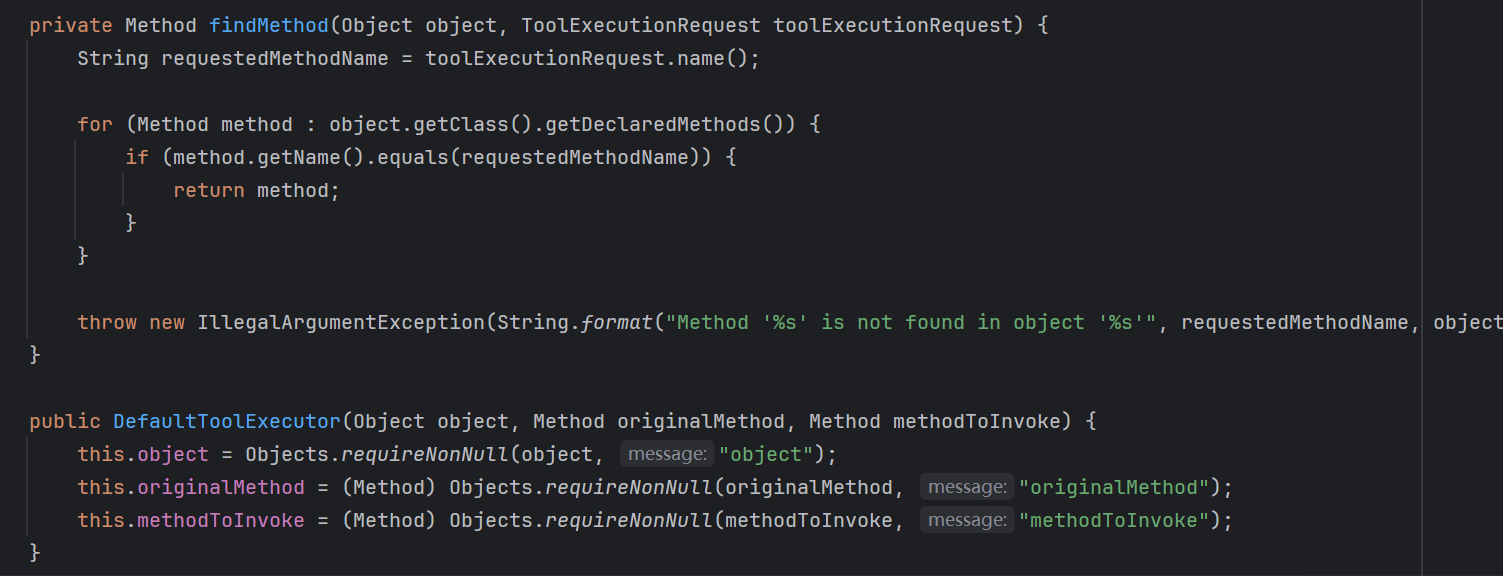 描述:用于接收LLM构建的请求信息(用ToolExecutionRequest封装)并根据请求信息执行传参和函数回调操作(function calling功能只能让AI构建请求信息,如函数名,参数等,具体执行需要自己监听和进行回调操作)