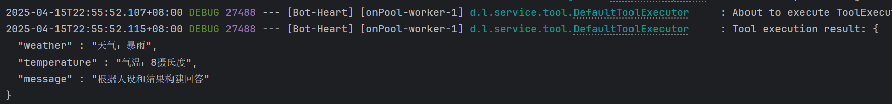 AiMessage { text = null toolExecutionRequests = [ToolExecutionRequest { id = "019639f2f8e293774223b34a23c7d96f", name = "getWeatherInfo", arguments = "{"city":"北京"}" }] }, ToolExecutionResultMessage { id = "019639f2f8e293774223b34a23c7d96f" toolName = "getWeatherInfo" text = "{