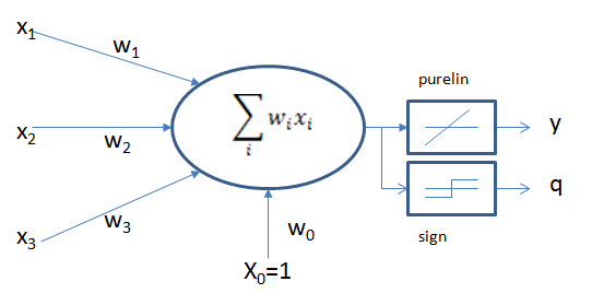 - 通常在训练的时候使用purelin函数,在训练完成后需要输出的时候使用sign函数