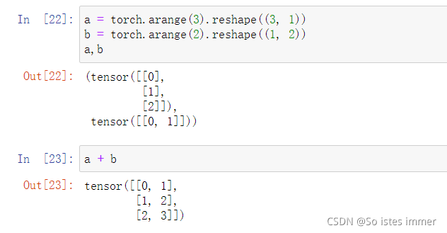 ③ +、-、*、/、**运算在tensor中升级为按元素运算,torch.exp()也可用来按元素运算