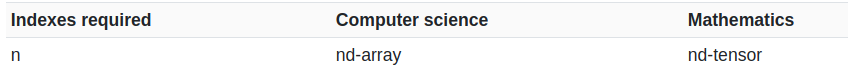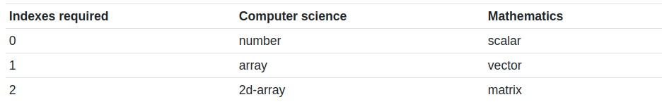 在计算机科学中,我们不再使用诸如,数字,数组,2维数组之类的词,而开始使用多维数组或n维数组(nd-array)。字母 n 告诉我们访问结构中特定元素所需的索引数。