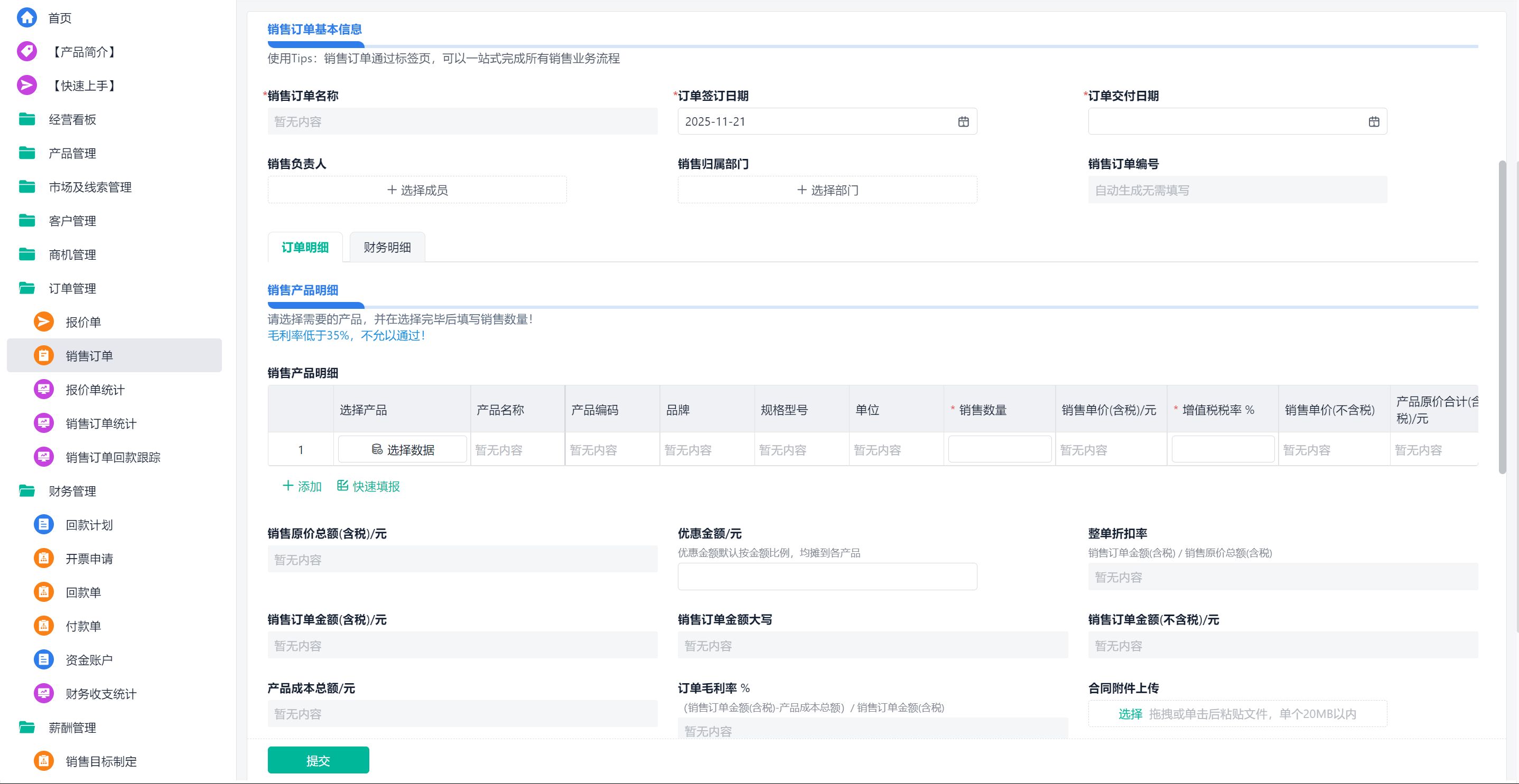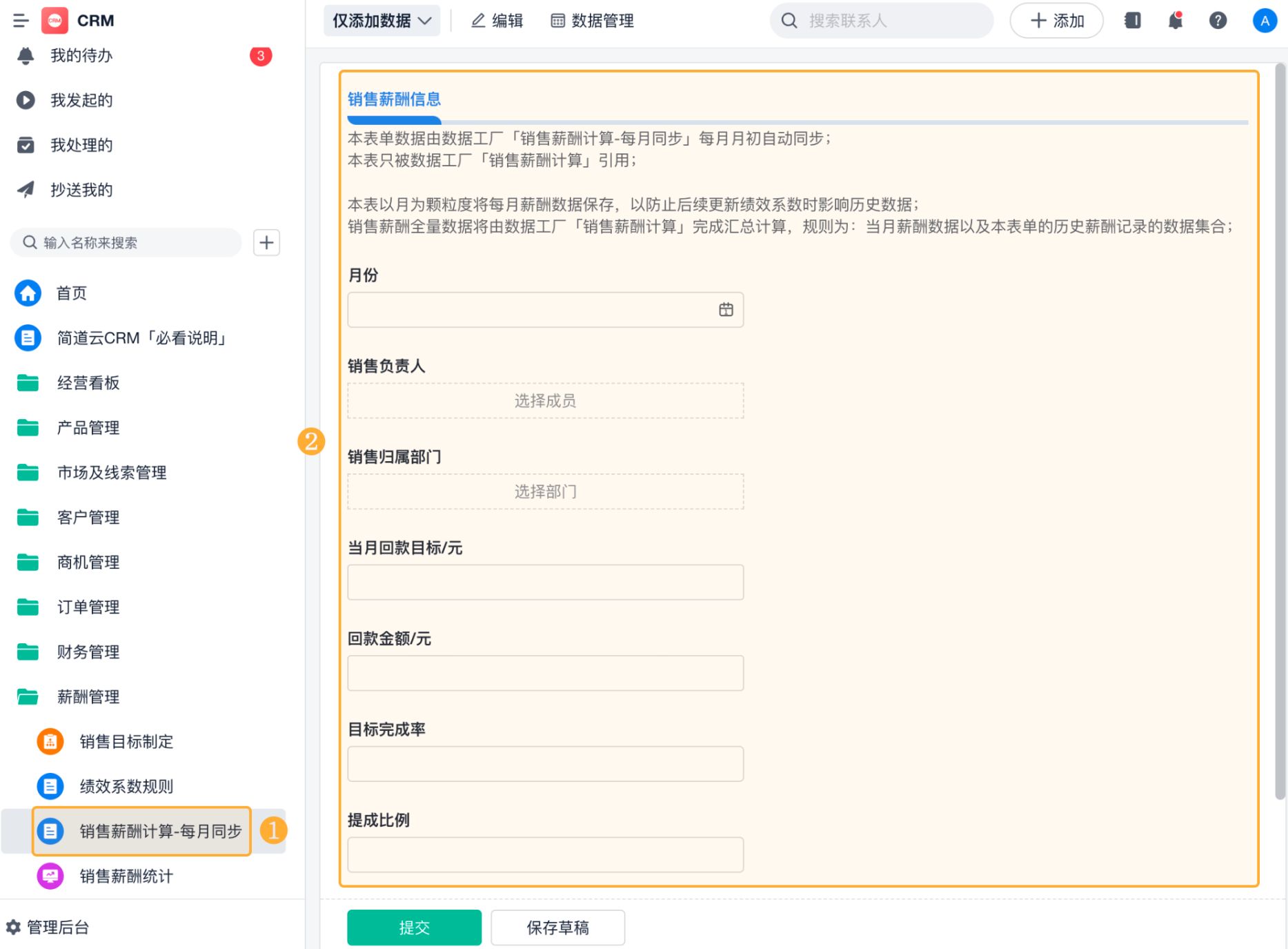 - 模板固定,操作简单:订单录入表单只需要几个字段,销售填完直接算提成。
