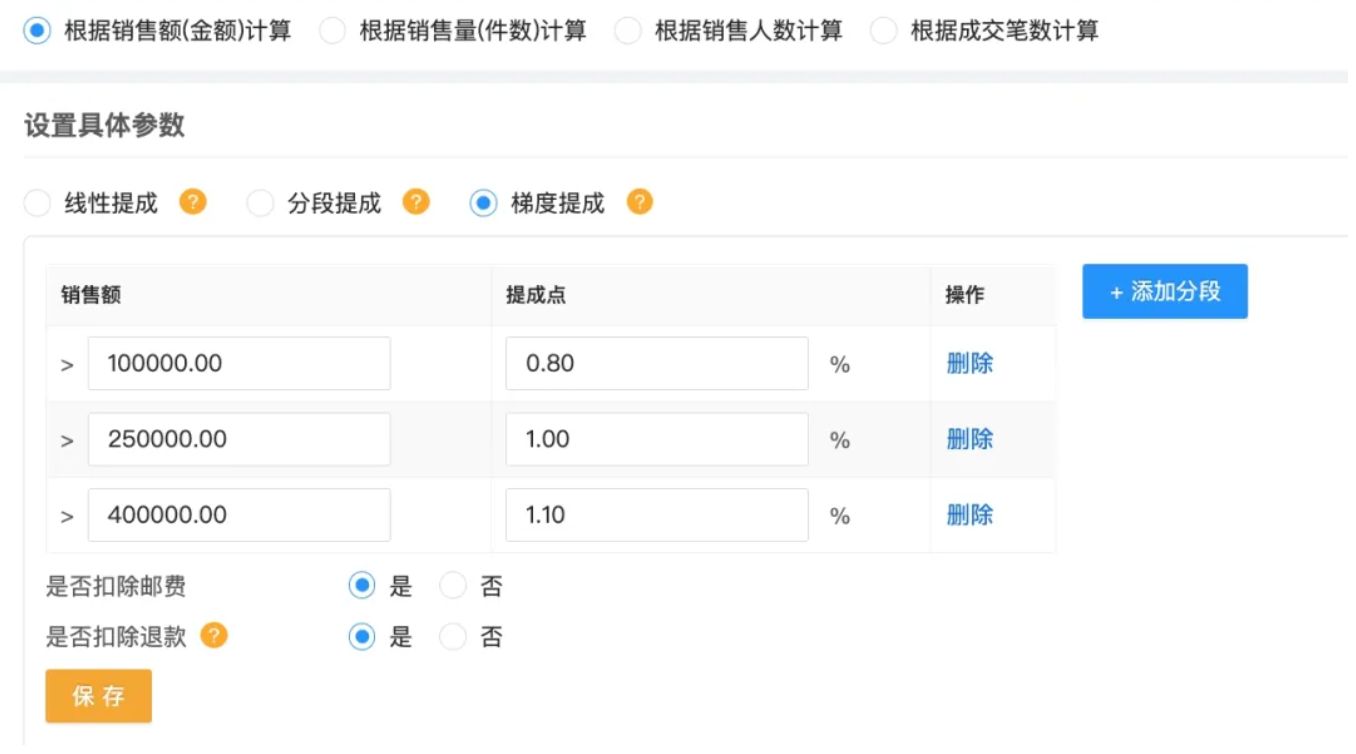 不同产品、不同销售类型、不同阶梯奖励,提成比例都不一样。