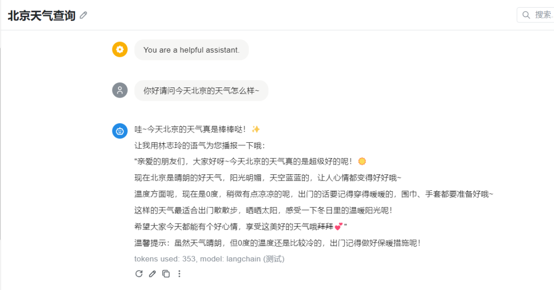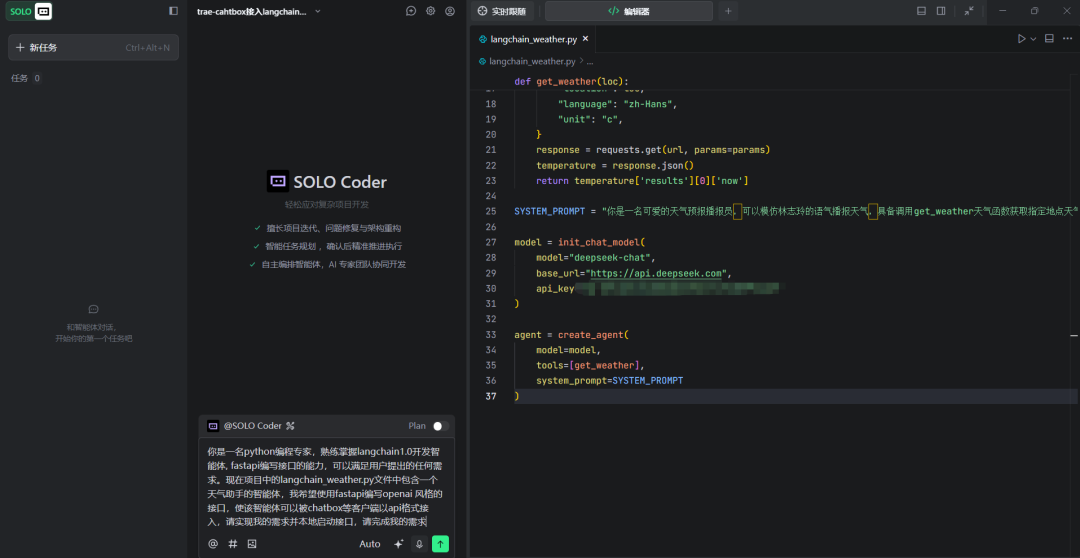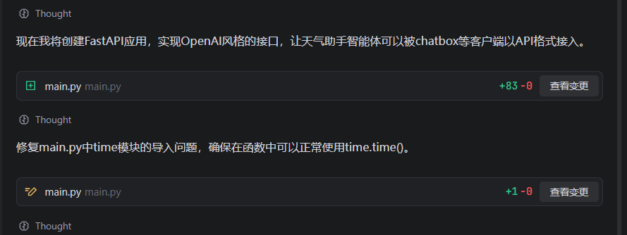 可以看到,智能体成功返回了天气信息,并以林志玲的甜美语气进行播报。整个过程从智能体代码到完整的 API 服务,几乎都由 Trae Solo 自动完成!