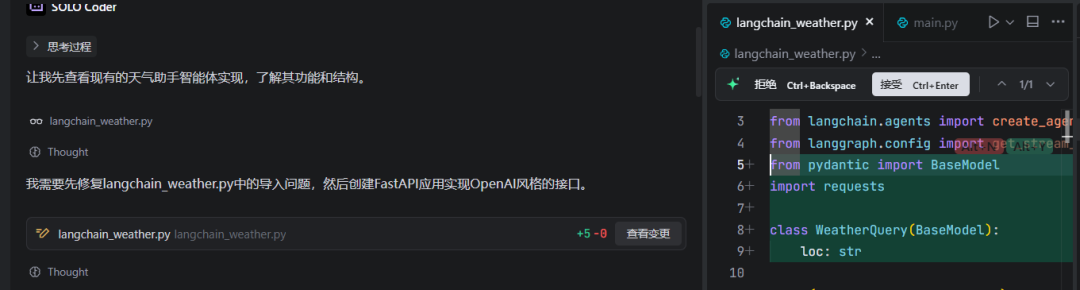 langchain_weather.py源文件,并识别出了代码中的一个 Bug——未定义WeatherQuery类型。 -