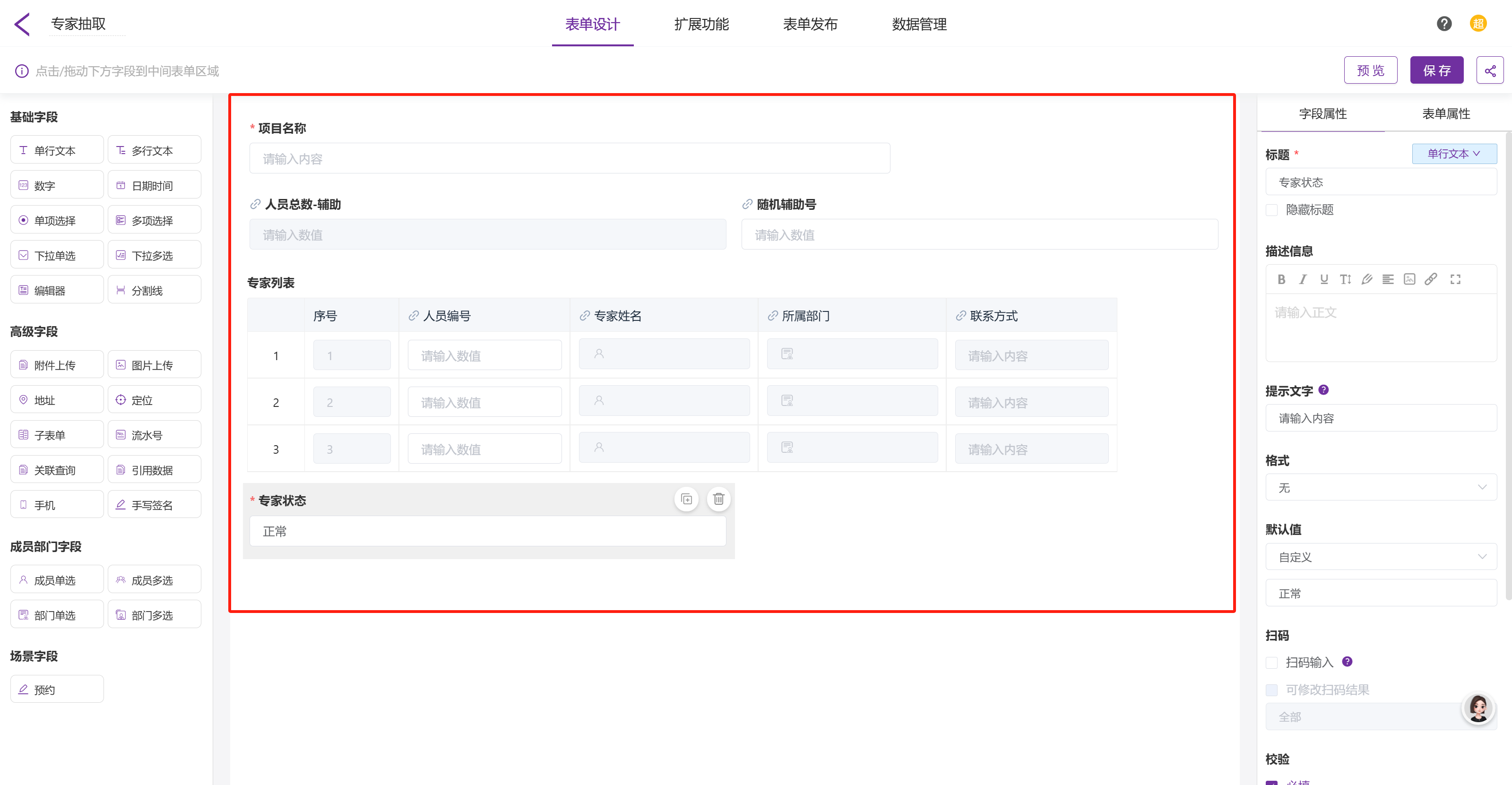 打开「专家库」基础信息表,表单中有不同类型的字段,专家库表单包含 5个字段:人员编号、姓名、所属部门、联系方式、状态