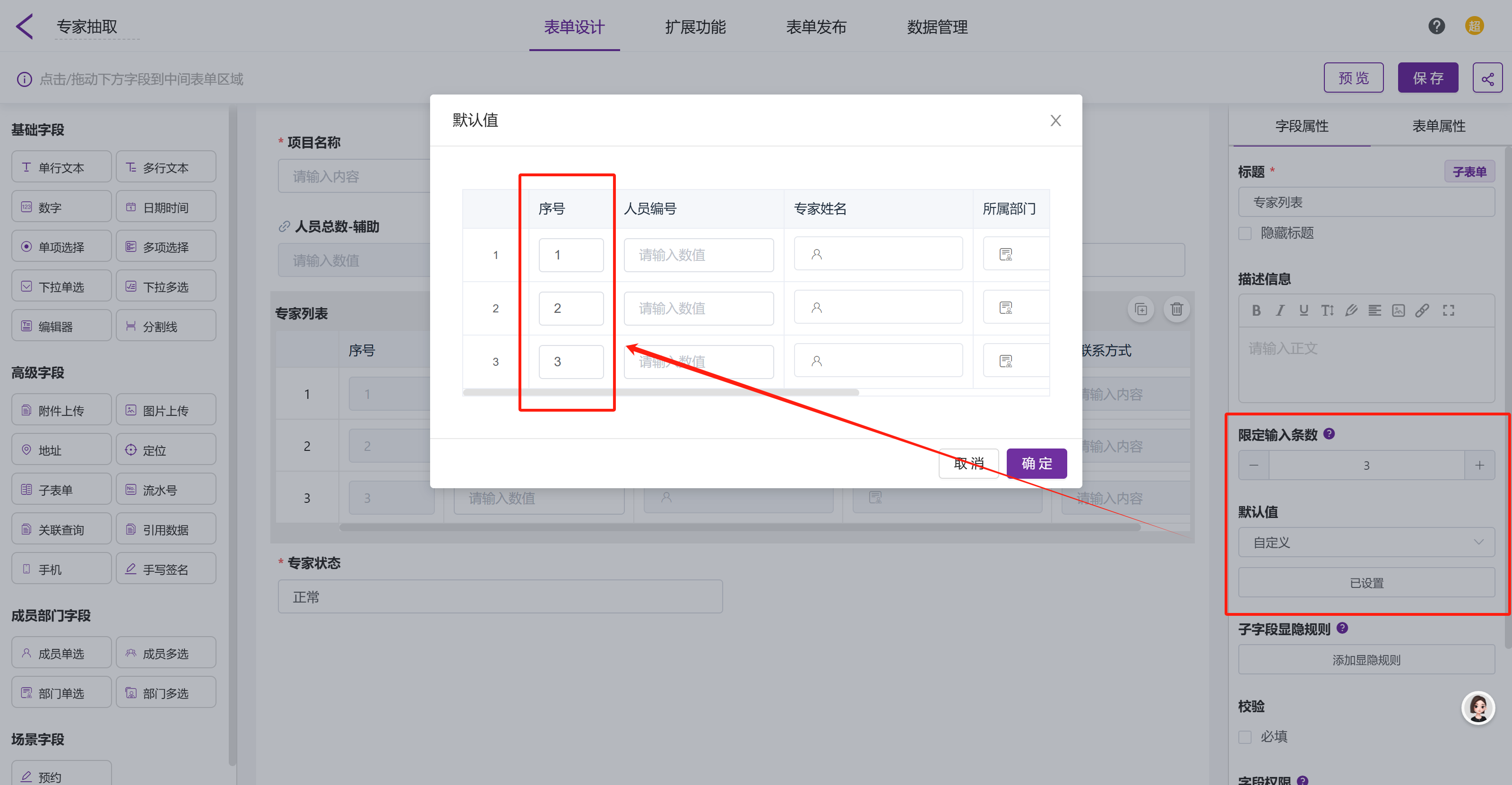 子表单.序号的设置:「子表单.序号」选用数字字段,并且将子表单整体默认值进行填写,抽取 3个专家则设置 3 行默认值,抽取 5个专家则设置为5行默认值,抽取 n个则设置为 n 行默认值从 1 填写到 n。