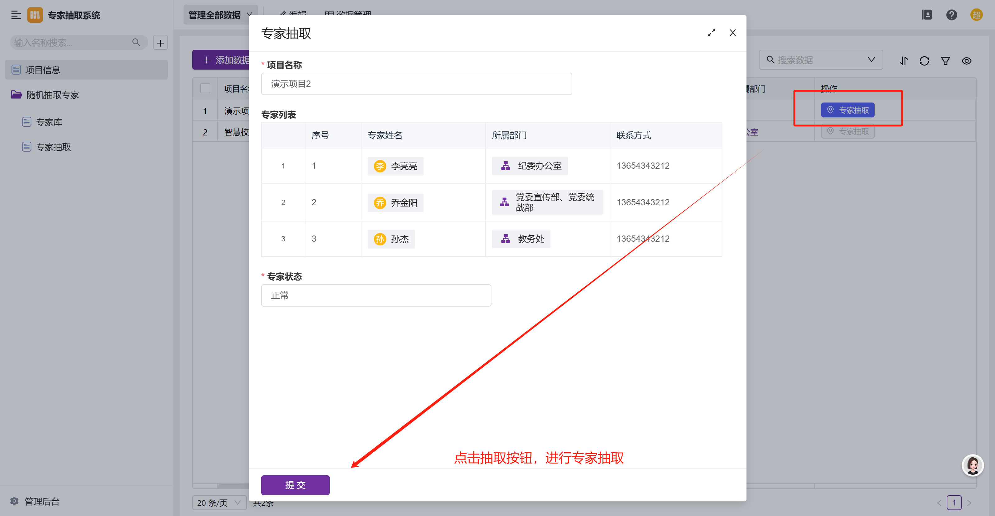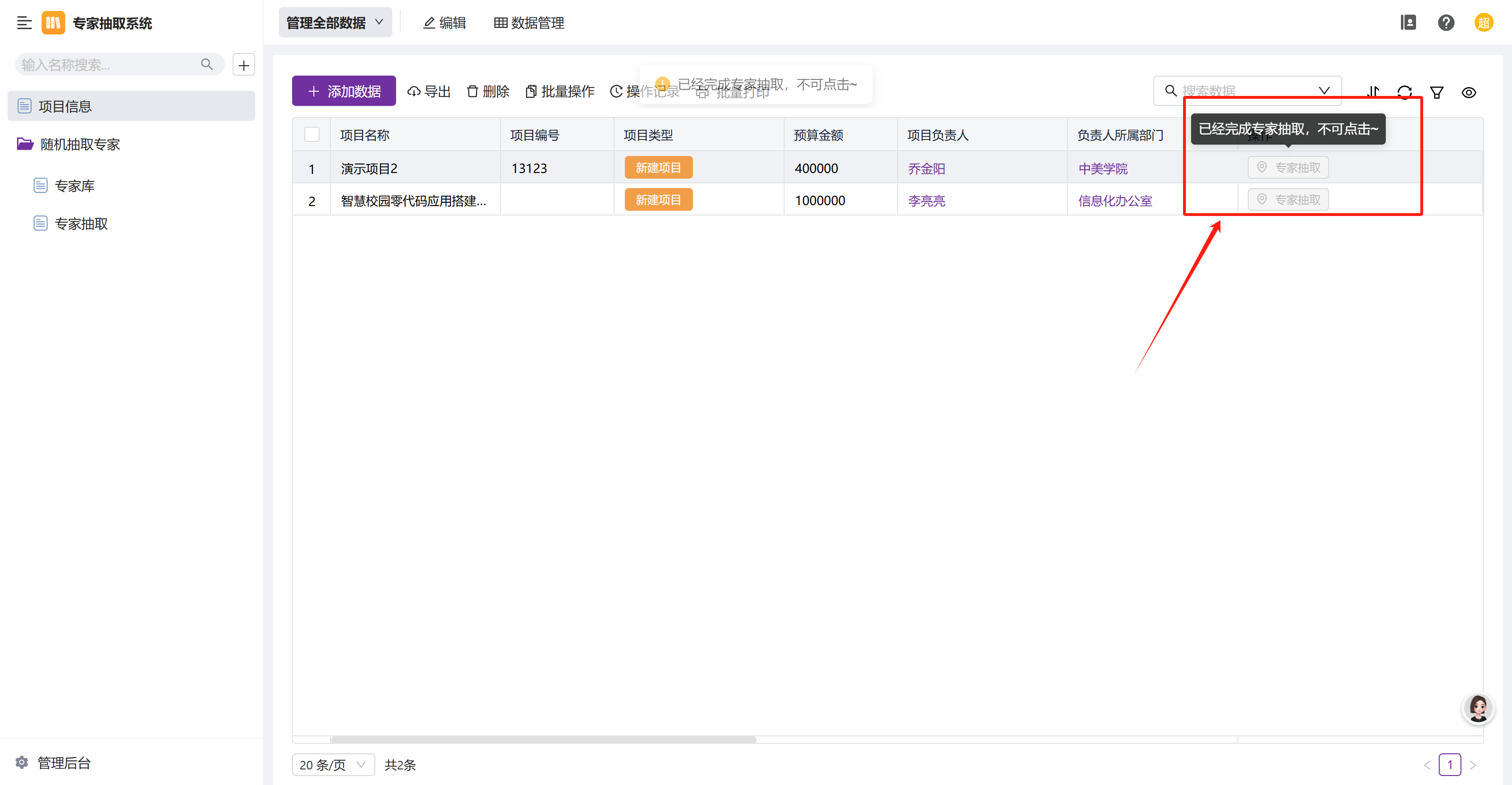 第二步:提交之后,,触发智能助手,更新项目表中的专家抽取状态,根据状态操作按钮会自动置灰。