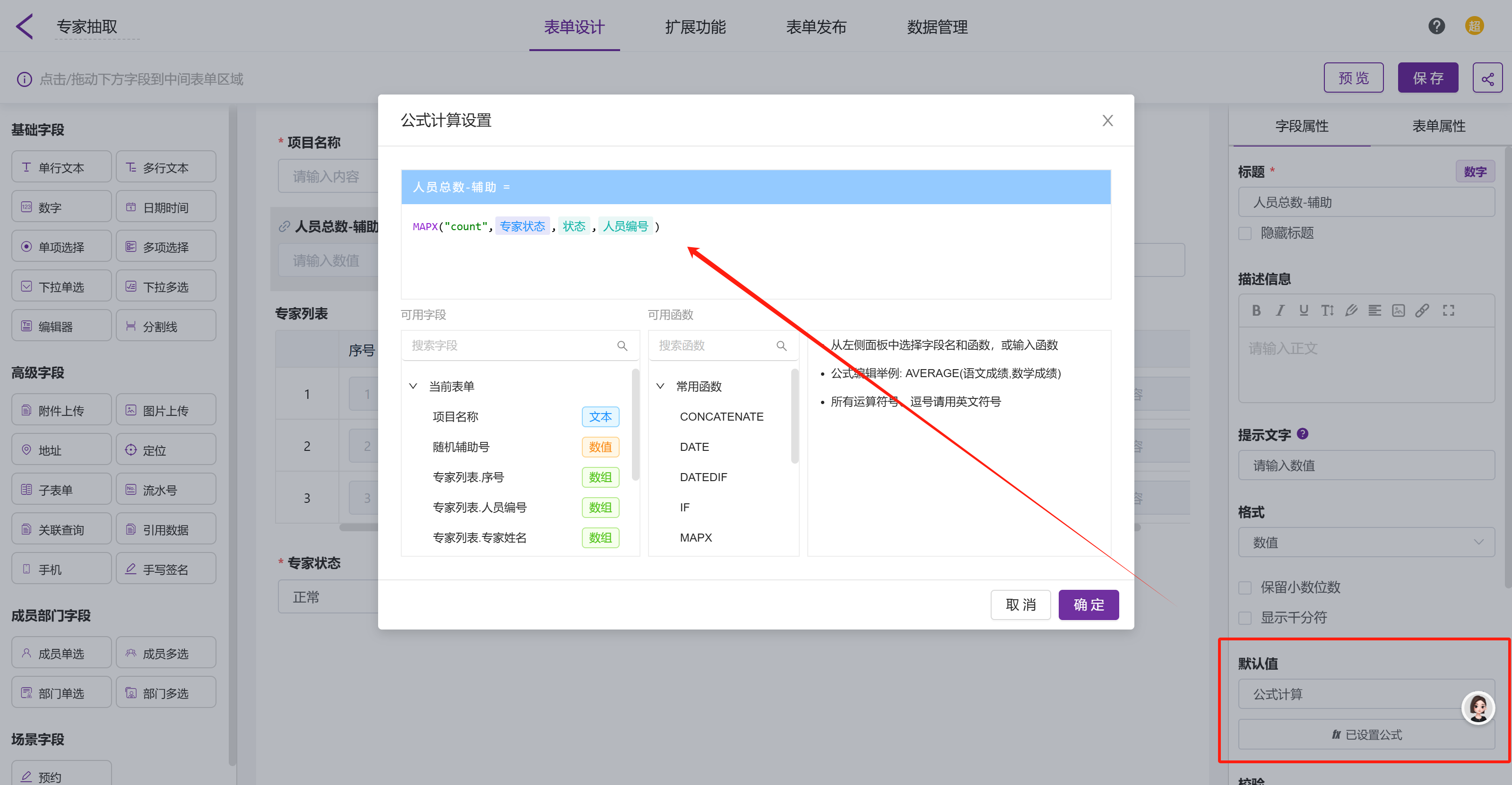 人员总数-辅助:「人员总数-辅助」选用数字字段,使用 MAPX函数计算出专家库中状态为正常的专家总数,公式编辑为:MAPX('count','专家状态',状态,人员编号)