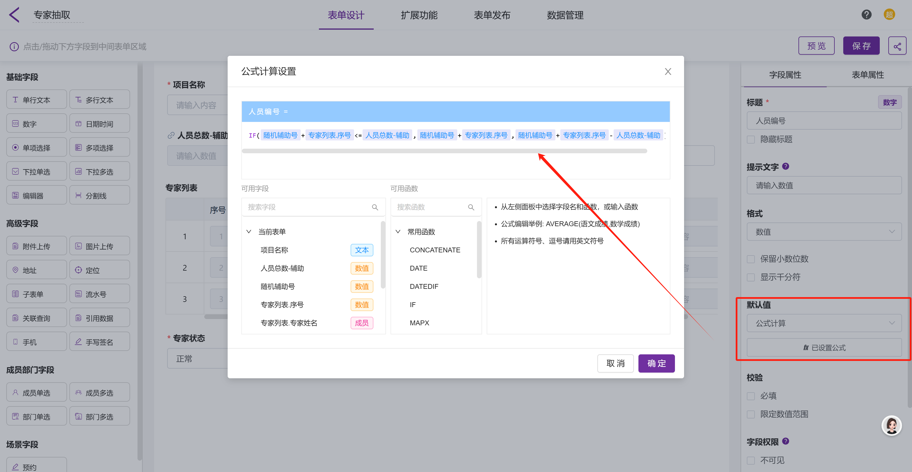 「子表单.人员编号」选用数字字段,利用 IF函数 进行条件判断,得到实际的编号。在随机辅助号的基础上加上子表单的序号,如果加上序号之后大于专家的总数,则减去专家的总数。