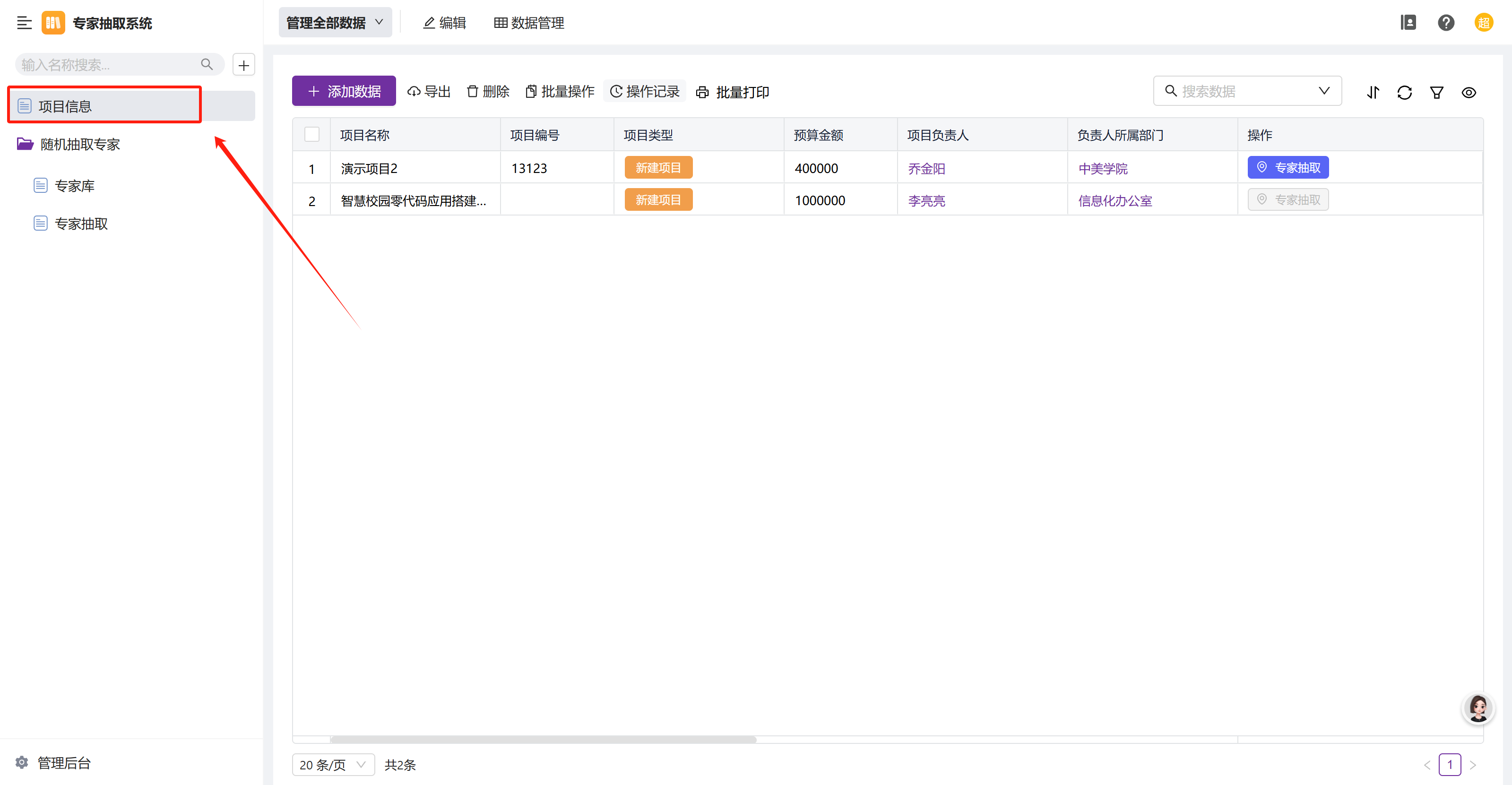 学校在做各类项目评审时候,需要给每个项目在专家库中随机抽取专家。我们尝试使用绘搭零代码平台实现这一需求。