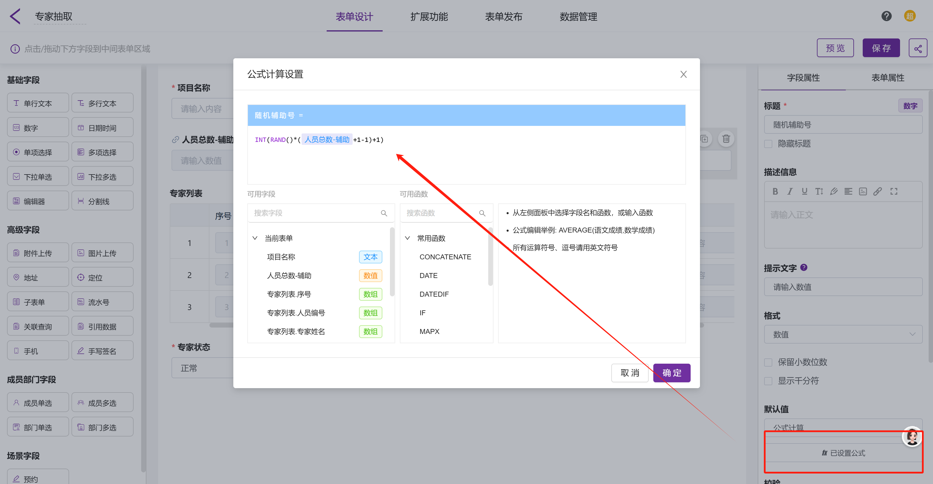随机辅助号:「随机辅助号」选用数字字段,利用 RAND函数 在 1 到专家总数之间随机抽取一个整数作为第一个专家的编号。公式编辑为:INT(RAND()*(人员总数-辅助+1-1)+1)